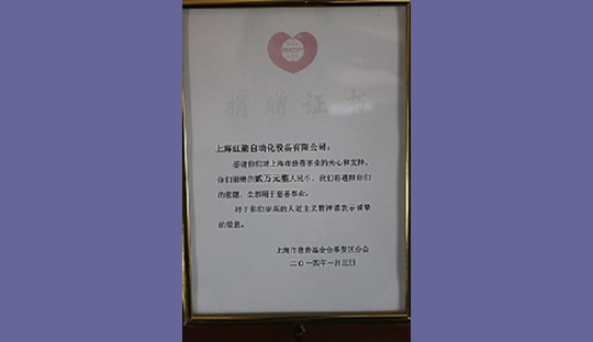 2014年,上海紅箭自動(dòng)化設(shè)備有限公司為上海市慈善基金會(huì)捐款 2014
